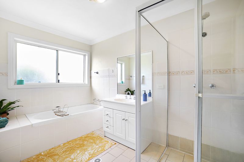 The upstairs has three bedrooms, the main with walk-in robe and balcony with escarpment views. The main bathroom features shower and separate bath plus a separate toilet.